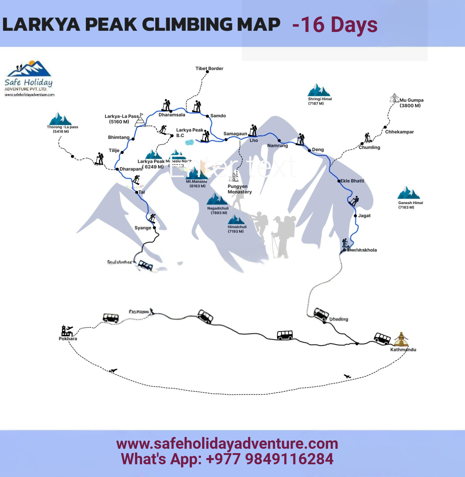 Note: Dear Travelers, The cost of the Larke Peak Climb and Manaslu Circuit Trek varies by season. Send us your preferred time and budget, and we will customize a package for you. For agents or mediators who contact us first and bring clients, if the group is over 10 people, they get 70% of the package free as a reward.