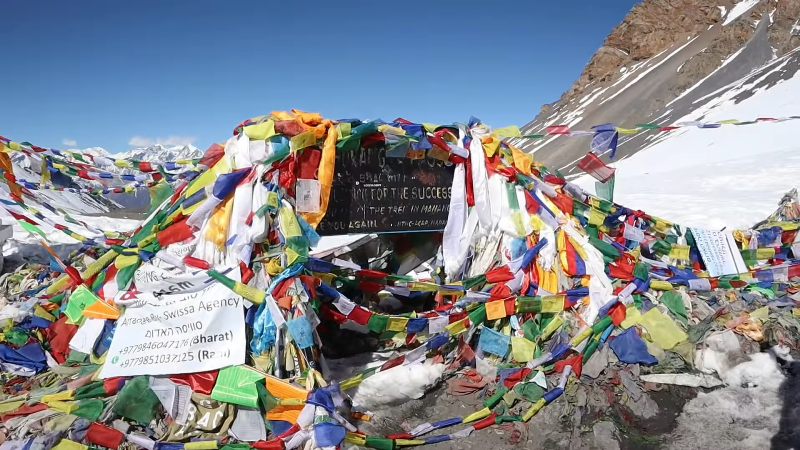 Il Passo Thorong La è il punto più alto del Circuito dell’Annapurna, con un’altitudine di 5.416 metri (17.769 piedi). I trekker solitamente lo attraversano di prima mattina per evitare i forti venti e godere di una vista chiara sulle montagne. A questa altitudine, l’aria è rarefatta, le temperature sono fredde e si può avvertire fiato corto o lieve mal di montagna. È importante camminare lentamente, idratarsi e fare pause. Il passo offre panorami mozzafiato sulle montagne Annapurna, Dhaulagiri e Nilgiri.
