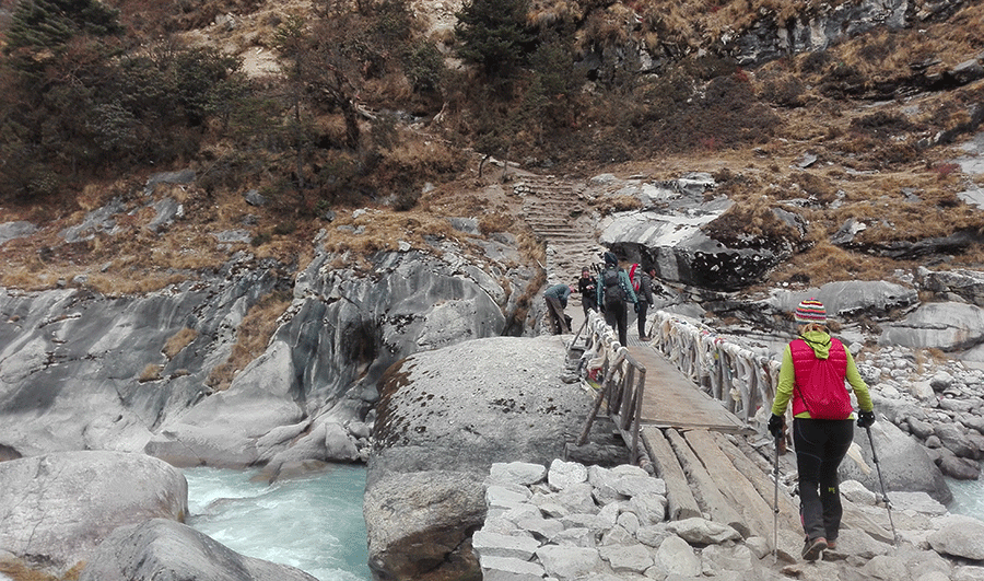 Wake up at 6 am and have breakfast. Today you descend through forests and villages back toward Namche Bazaar. The trail passes small Sherpa settlements, mani walls, prayer flags, and terraced fields. Cross suspension bridges over rushing rivers.
